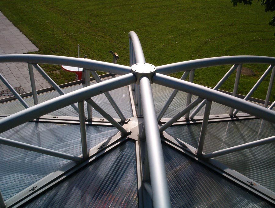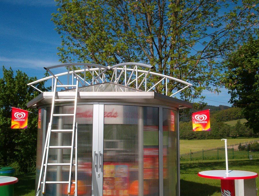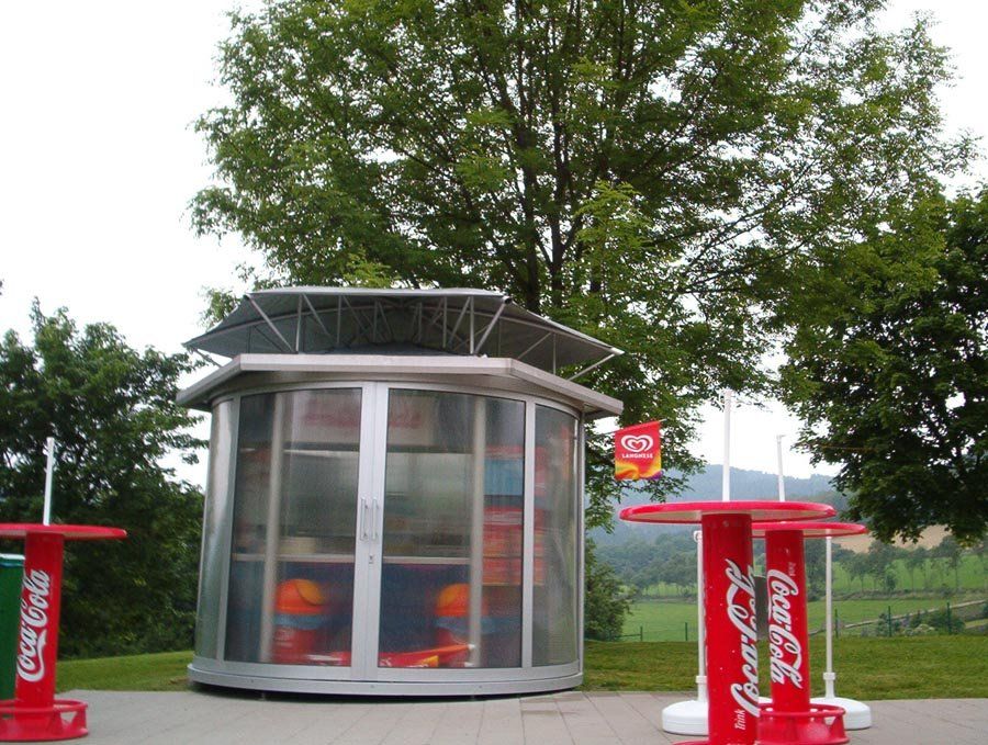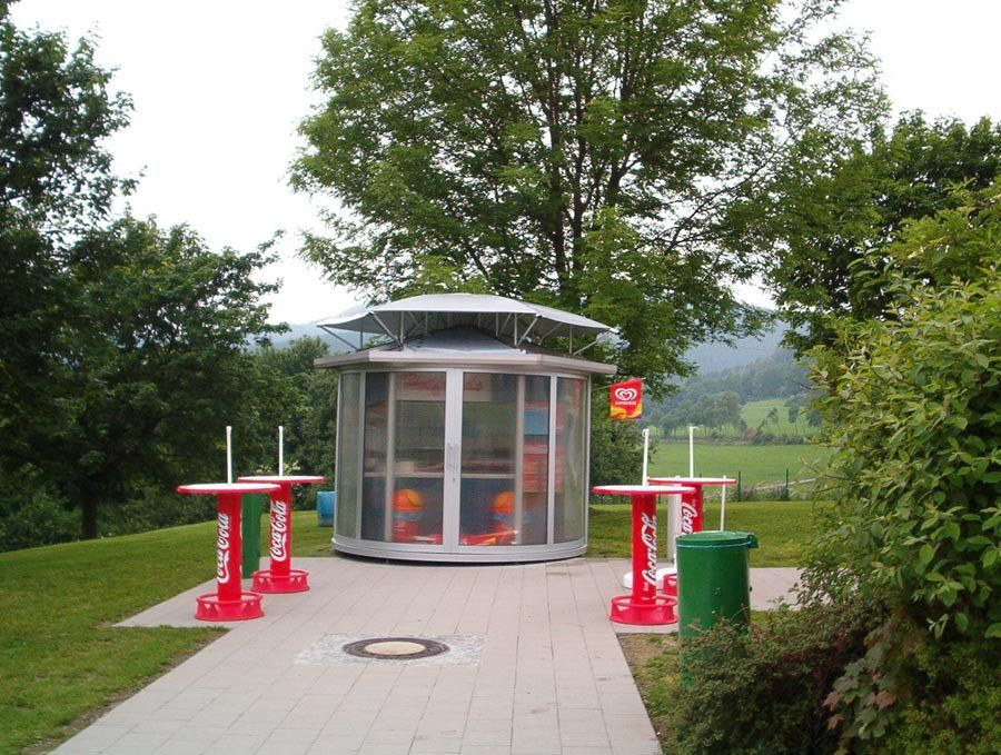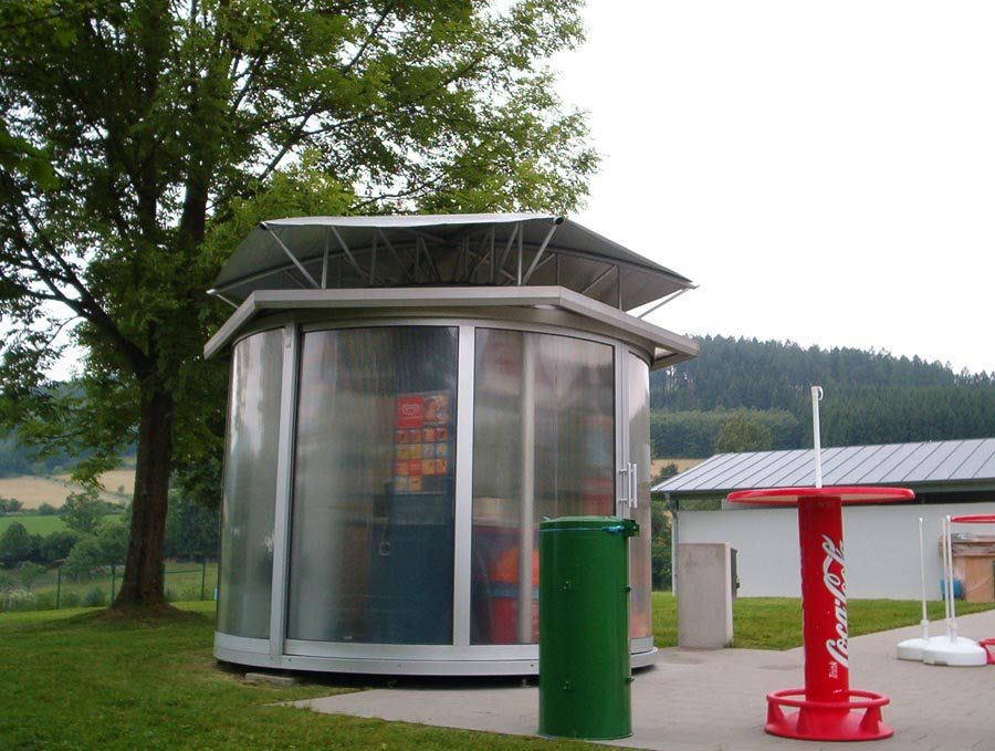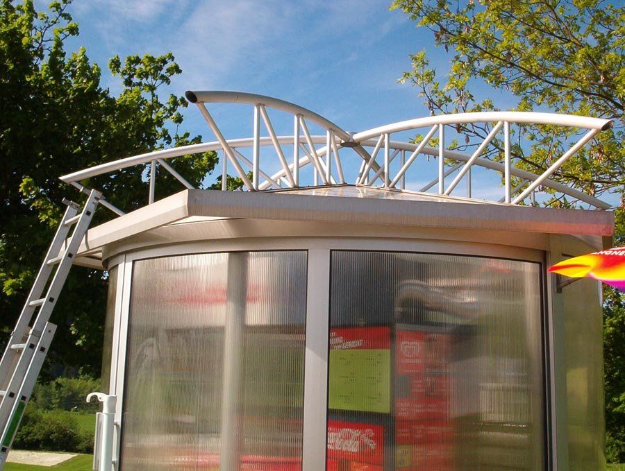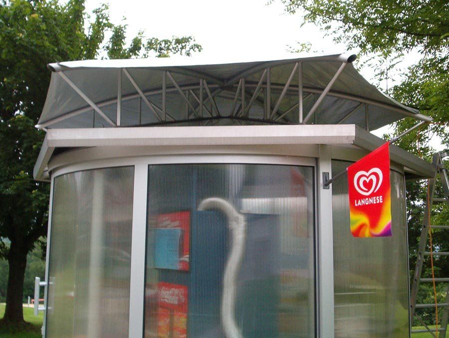 Hier wurde ein Kiosk im Schmallenberger Freibad mittels einer Sonderkonstruktion vor direkter Sonneneinstrahlung von oben geschützt. Der Sonnenschutz ist auf einer sechseckigen Stahlrohrkonstruktion aufgespannt