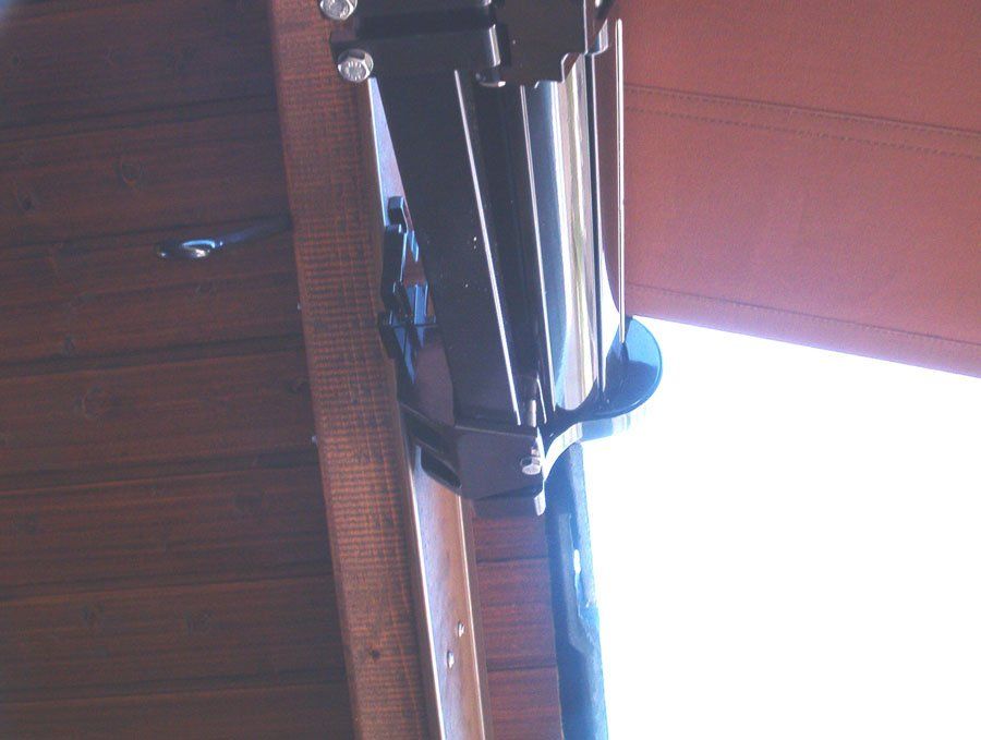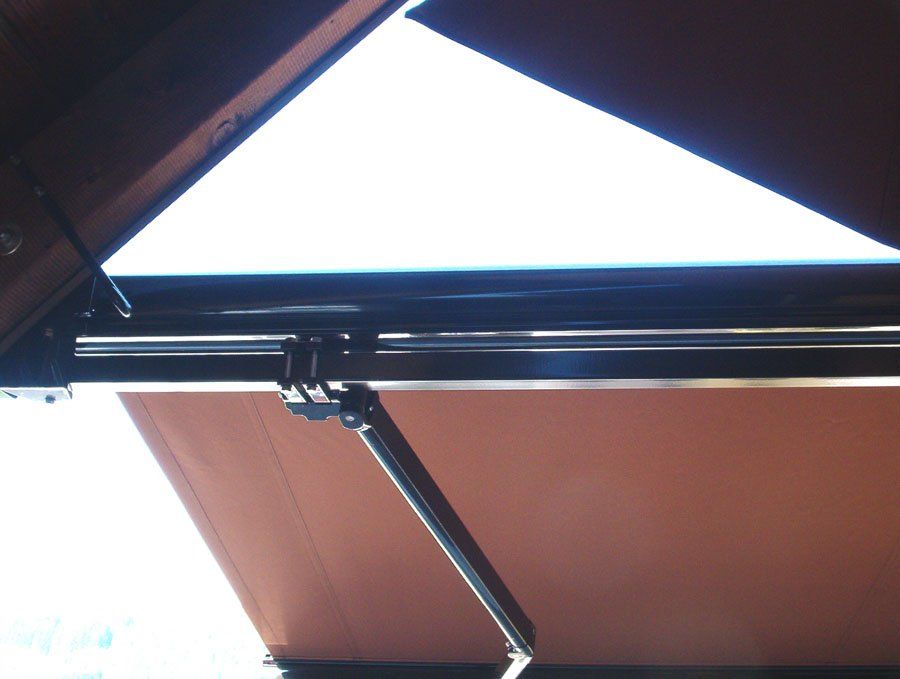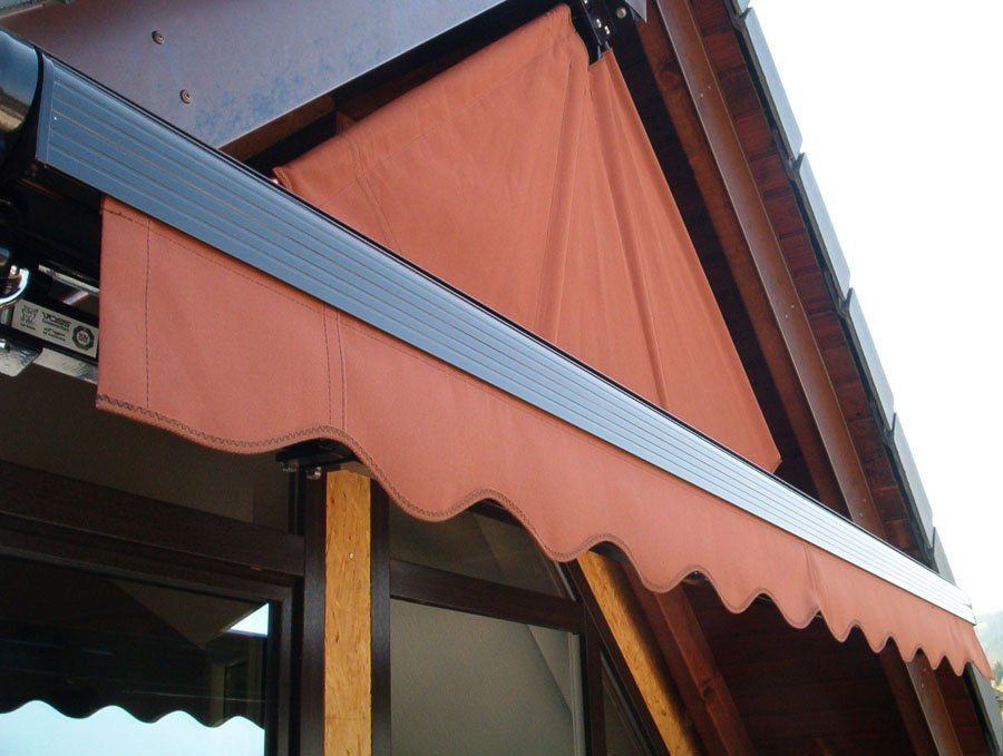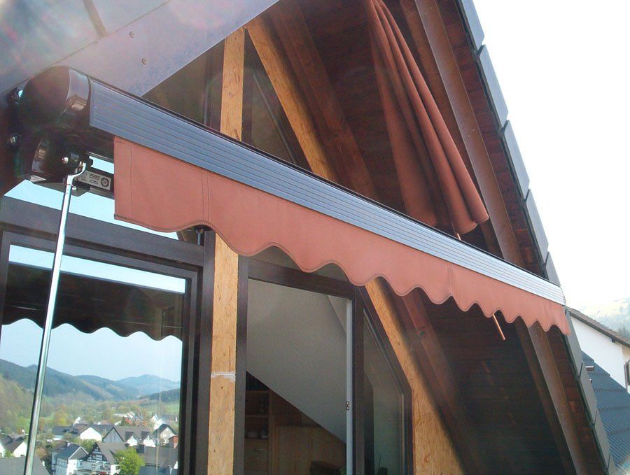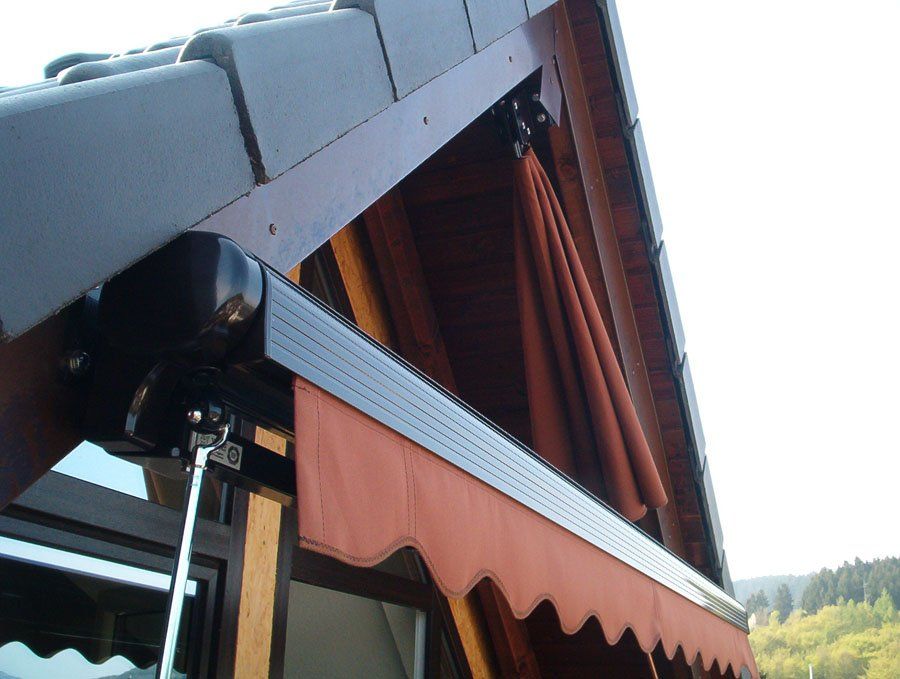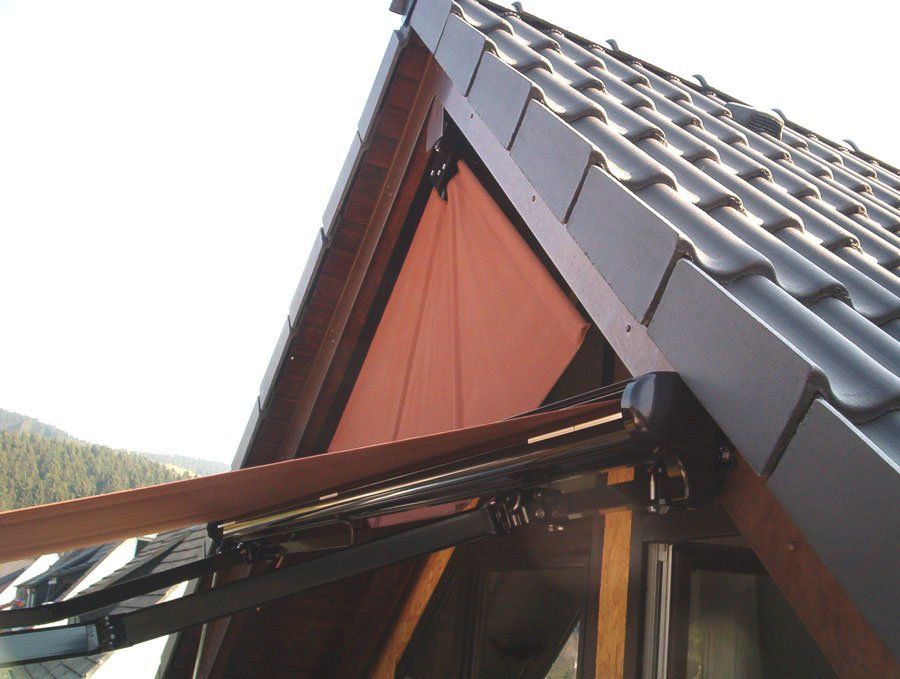 Hier wurde ein Dachgiebel beschattet. Die Markise wurde direkt an die Sparren des Giebels montiert. Der freie Raum oberhalb der Markise wurde mit einem Wandklappschirm beschattet.